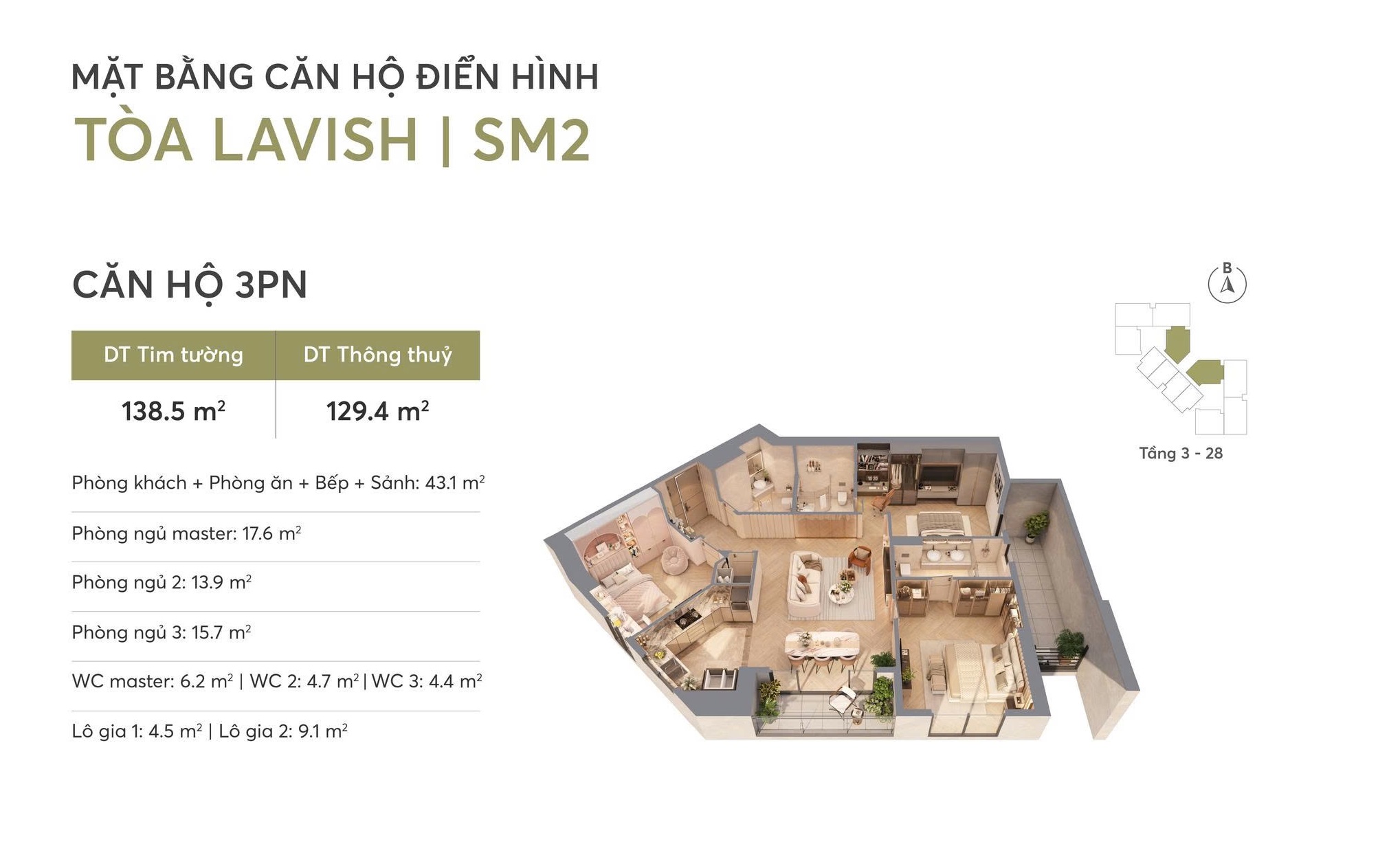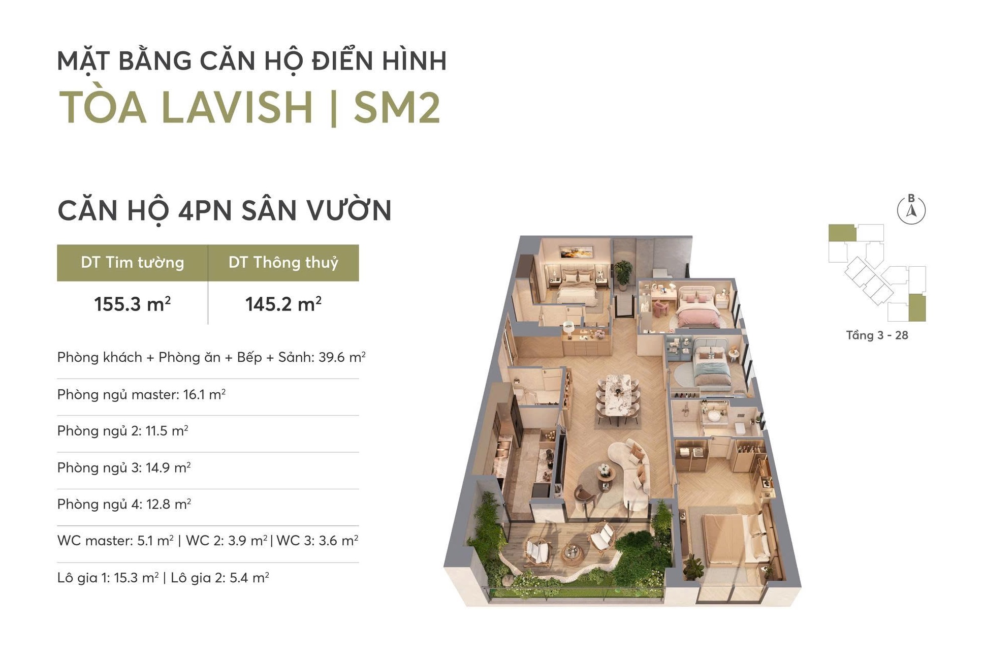- Loại căn 3PN thường và sân vườn (124–138m²)